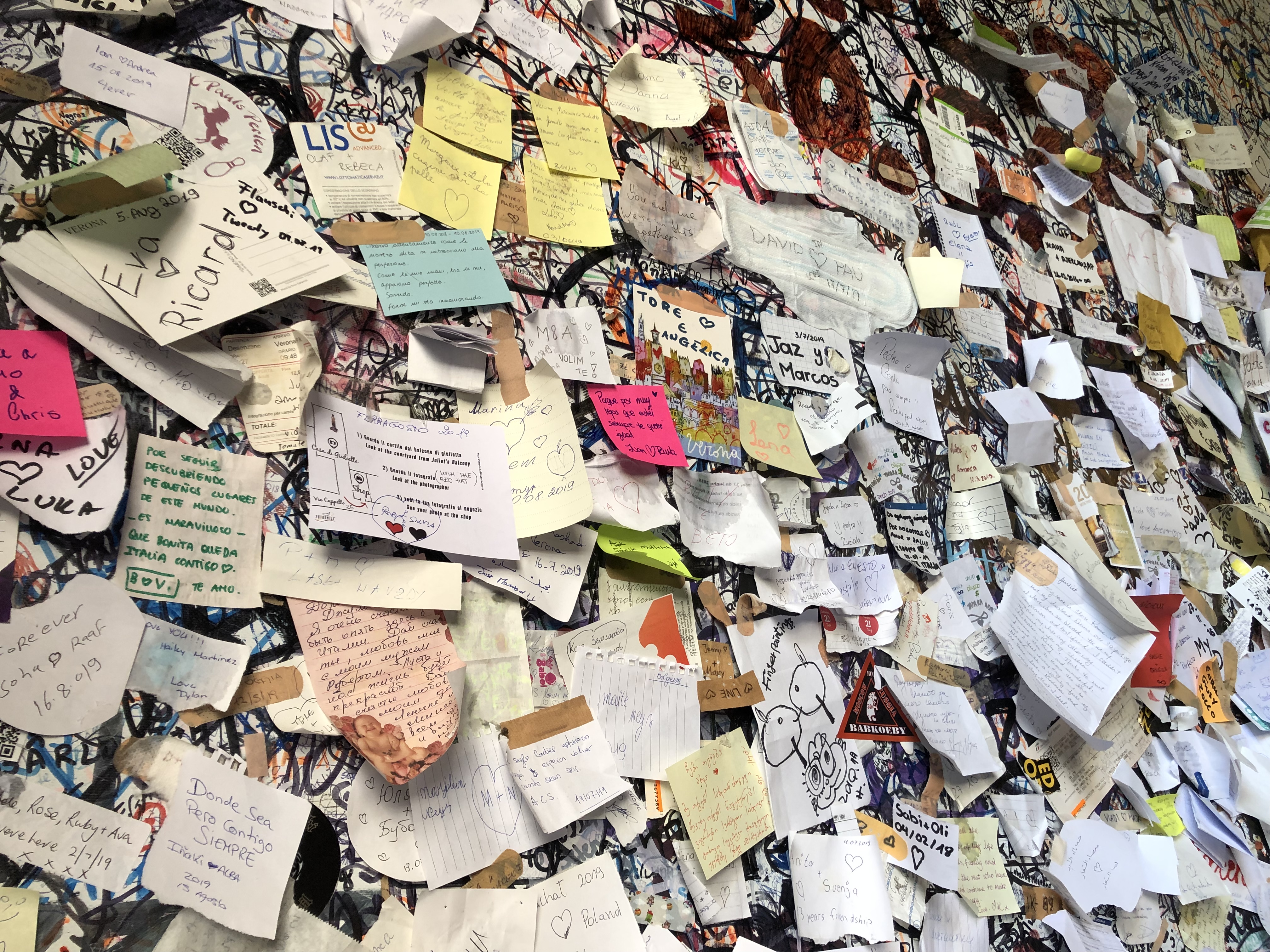 Le balcon de Juliette, les mots d’amour (sur des supports plus ou moins élégants) et leur chewing-gum (ou autres objets partagés) déposés par les amoureux du monde entier