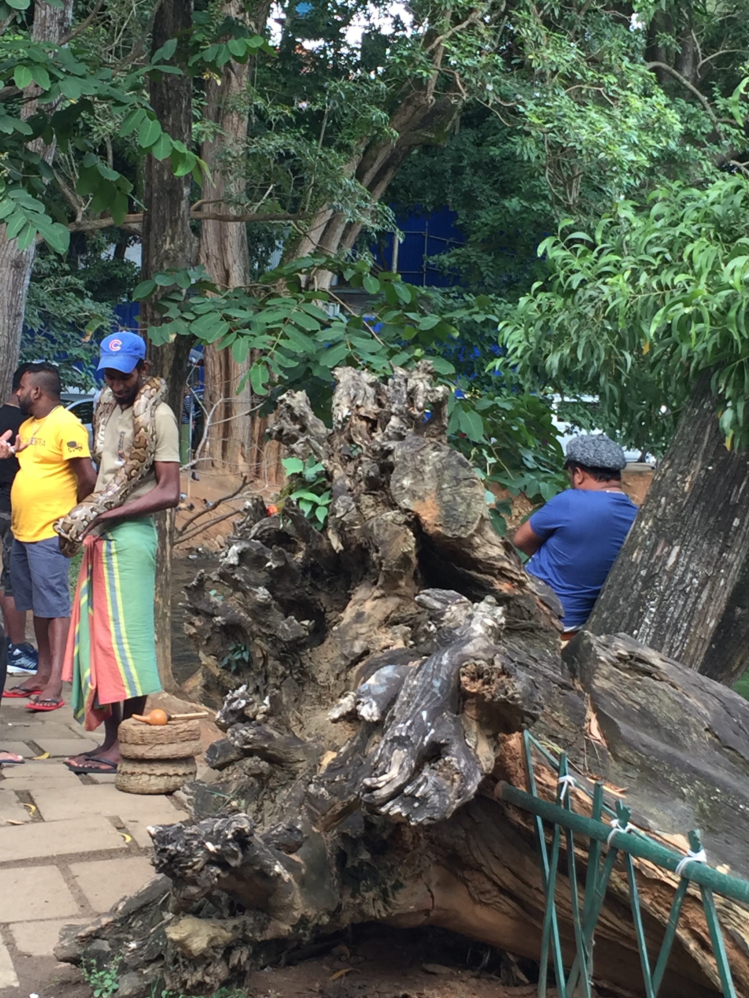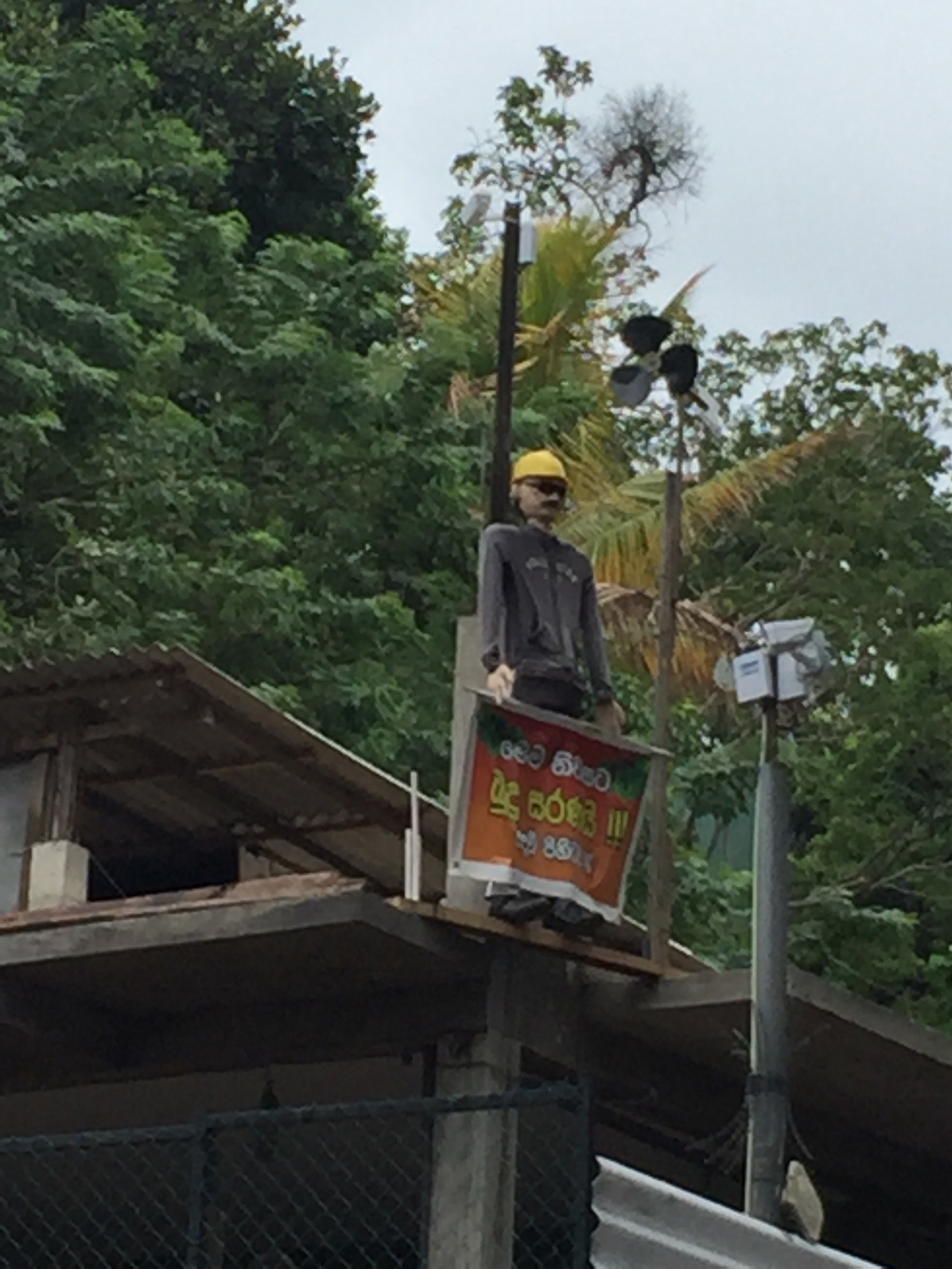 JOUR 3 : Balade dans Kandy – Rencontre avec un animateur de rue et son « animal de compagnie » . Un épouvantail sur une bâtisse en construction pour repousser le mauvais sort , L’office notarial local et une église avec un bénitier un peu spécial …