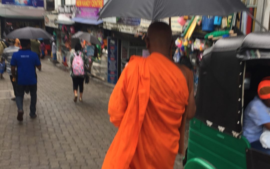 JOUR 3 : Balade dans Kandy – Rencontre avec un animateur de rue et son « animal de compagnie » . Un épouvantail sur une bâtisse en construction pour repousser le mauvais sort , L’office notarial local et une église avec un bénitier un peu spécial …